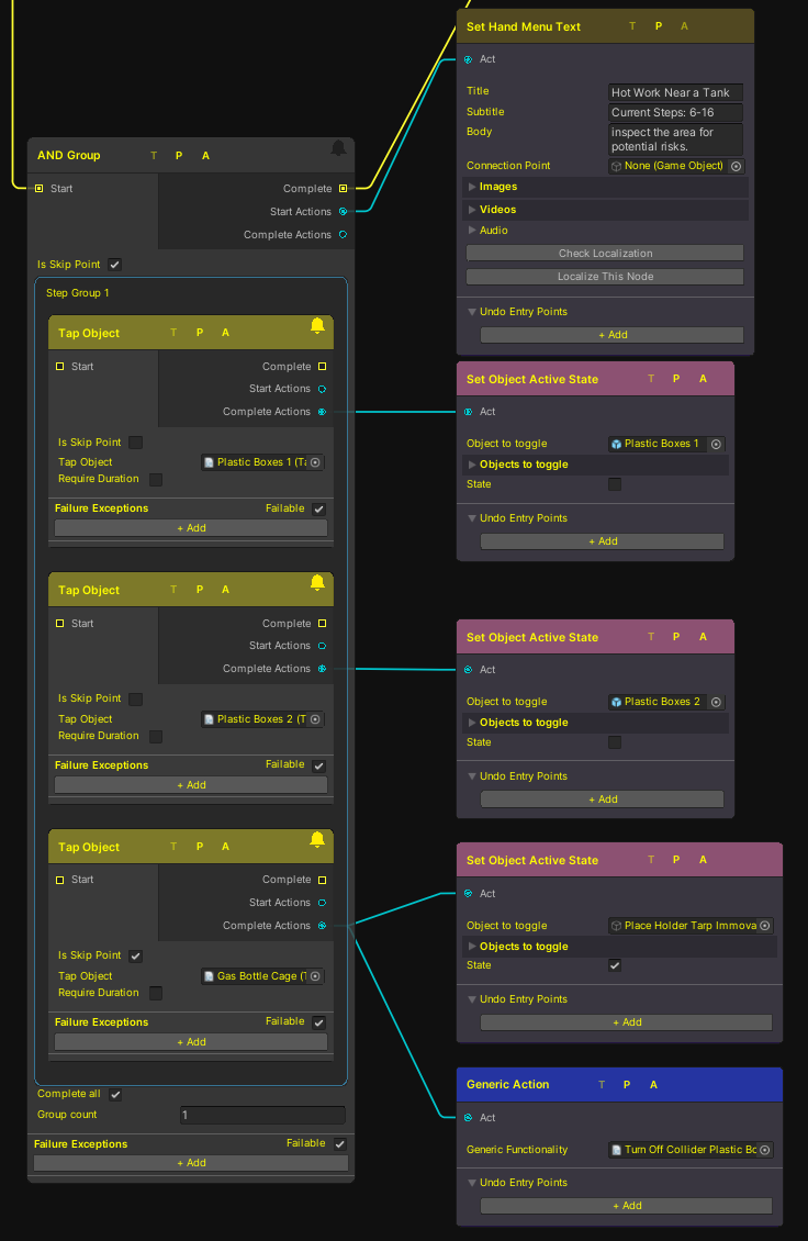 AND Group Node in action, It's possible to set up the work site in any order as long as all steps are completed.