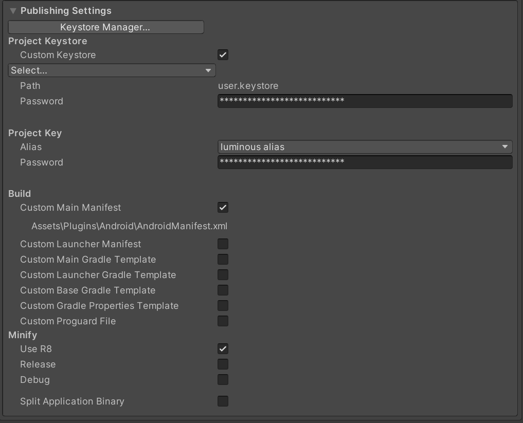 - If you are releasing a build onto a public storefront you need to sign your App. Scroll down to Publishing settings in the Player Settings Window.