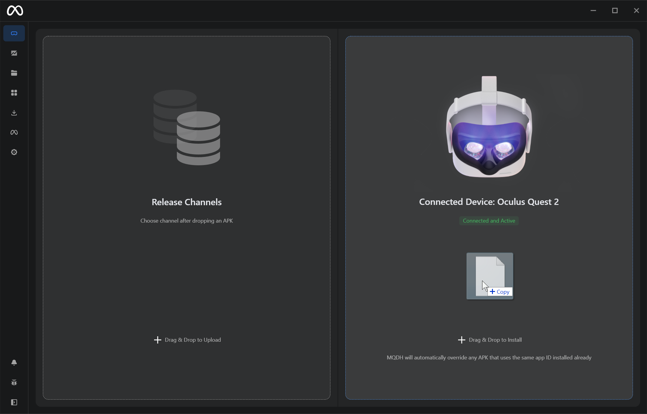 - Click on Device manager and drag your newly built APK over the window and drop it on the connected device.