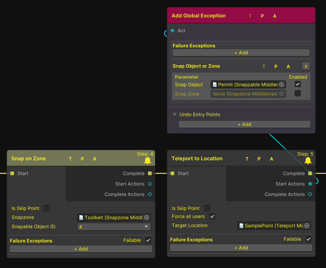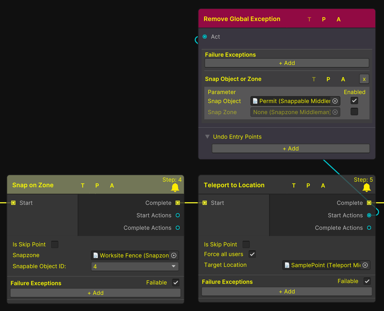 To address the above, we can use the "Remove Failure Exception" node. By removing the earlier global exception for the permit, we can configure it to fail if snapped anywhere else after being attached to the worksite fence.