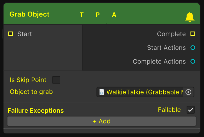Grab nodes, as the name implies, requires a user to grab an object to progress. This could be grabbing a tool, a walkie talkie or even a fire extinguisher. Find an example of this already set up for you in Flow-SDK → Ready to Use Prefabs → Grabbable Sample