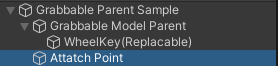 In the provided Grabbable Sample Prefab you will notice a child GameObject called Attach Point, this will be where a user will precisely hold the object once grabbed. For example if you wanted to set up a baseball bat you would move this transform to be in line with the bats handle.