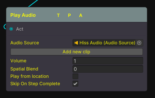 A Play Audio action is exactly what the name says, it plays an Audio Source with whatever clip is inside it. This can be useful to give the player Audio feedback after or before a step, such as hiss noise after a valve turn or a lunch alarm after the work has been partly completed.
