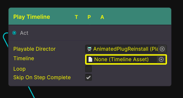 The Play Timeline (Action) behaves very similar to the Play Timeline (Step). The only difference is because this is a Action node, it will not progress the player through the graph when the animation has finished. This can be used to play animations where the user does not need to wait for them to finish to continue, this could be A Fan moving once being turned on, a worker walking off site, or even a Helicopter blade spinning.