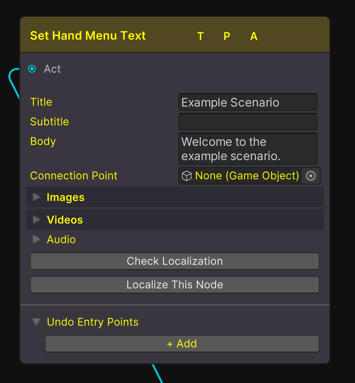 The Hand Menu is an integral part of a users experience of a scenario. The Set Hand Menu Text Node allows us to set the text displayed in the hand menu when the action is called.