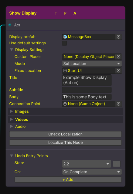 Due to the nature of display nodes being the main text you use to guide users it is worth noting that these nodes can be automatically localized using our own tooling that uses Google’s Translate API and read out using Googles Text-to-Speech Api. More information about out localization tools can be found here. Importantly only the body text will be read out and the title/subtitle sections will automatically get silent tags applied when localizing.