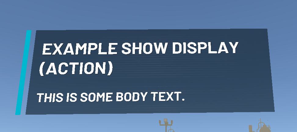 The Show Display (Action) works very similar to the Show Display (Step) the only difference is because this node is an action node, it means no input is needed from the user. It is for that reason the prefab we supply to the Show Display node for this action step does not have a button the user can press to progress the graph.