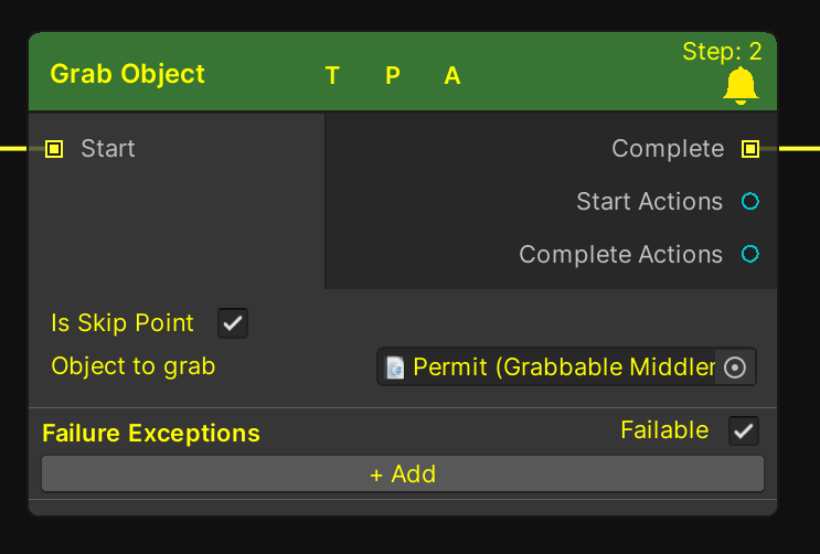 While all steps share these basic functionalities, individual step types introduce their unique features tailored to their specific interactions. For instance, the 'Grab' step includes a specific “Object to Grab” parameter. Only by interacting with the specified object can users progress in the scenario; other objects, even if grabbed, won't advance the training.