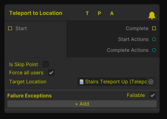 A Teleport to Location step is a step that will complete once a user has teleported to the specified teleport point. This can be useful to ensure a user is in the right location for another step. For more information on Teleports see the Teleport Point Page in Locomotion