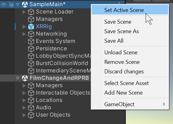 Right click “PlayerVR” and set it as active. If “Set Active Scene” is greyed out it means the scene is already active.