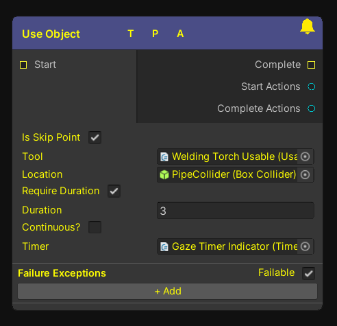 The use step is used when ever an object must be used on another object. This is quite vague but allows the use many different scenarios where objects can be “used”. For example a Use step could be used for a welding torch to be used on a broken pipe. It could also be used for a grinder on a door or even a fire extinguisher on a fire.
