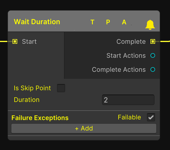 The wait duration node is simple step that will wait a given amount of time before automatically progressing. This can be helpful for times when a brief pauses is needed in the flow of the scenario. This could because an animation needs to finish or some visual element needs to finish playing before it would be suitable to move on.